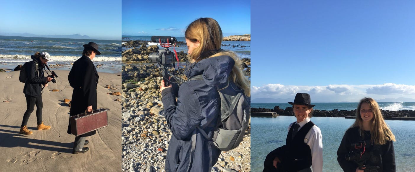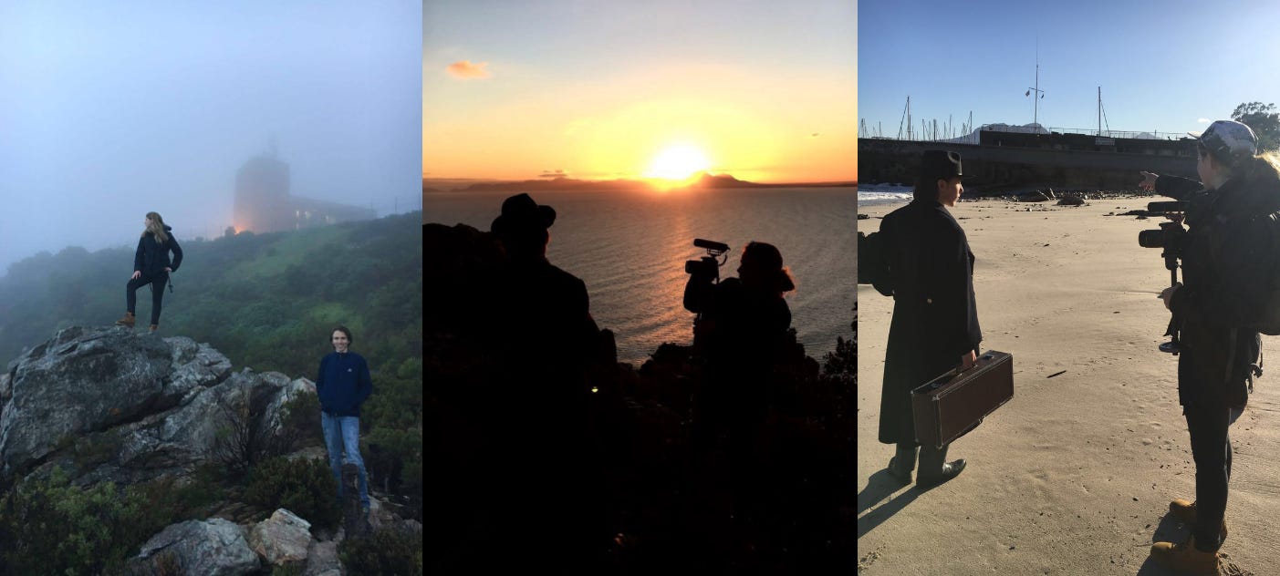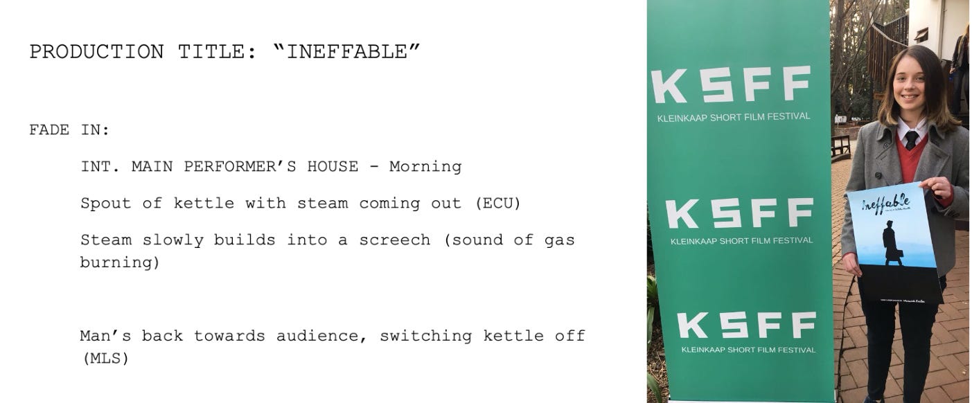 So before I knew how to write a script or plot out story beats or have an inciting incident or a climax, I wrote Ineffable. It’s barely a story and more an idea with visuals, but it meant something to me then and means something else entirely to me now. Luckily, Warwick was fully on board to perform and compose the music, and my dad was on board (maybe not as voluntarily) to be our driver and designated adult through it all. And so, we made a movie and even travelled across the country for part of it because I was obsessed with Cape Town at the time.